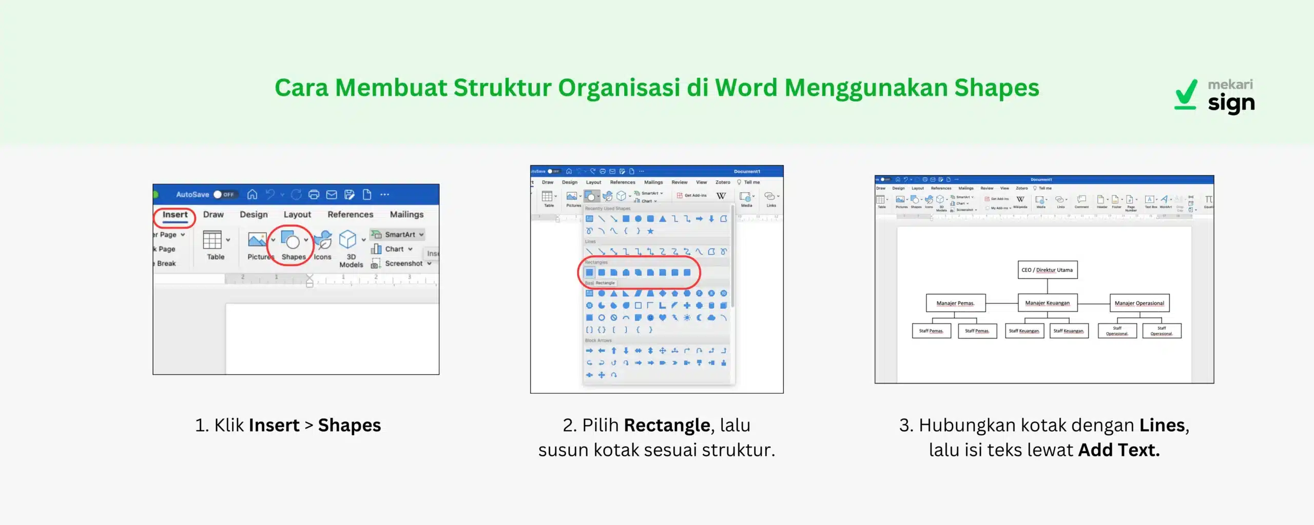 Setelah memahami berbagai jenis struktur organisasi, sekarang saatnya untuk belajar bagaimana cara membuatnya di Word. Microsoft Word menyediakan dua metode utama: menggunakan SmartArt untuk cara otomatis atau Shapes untuk cara manual.