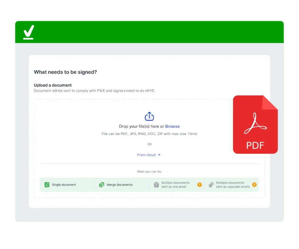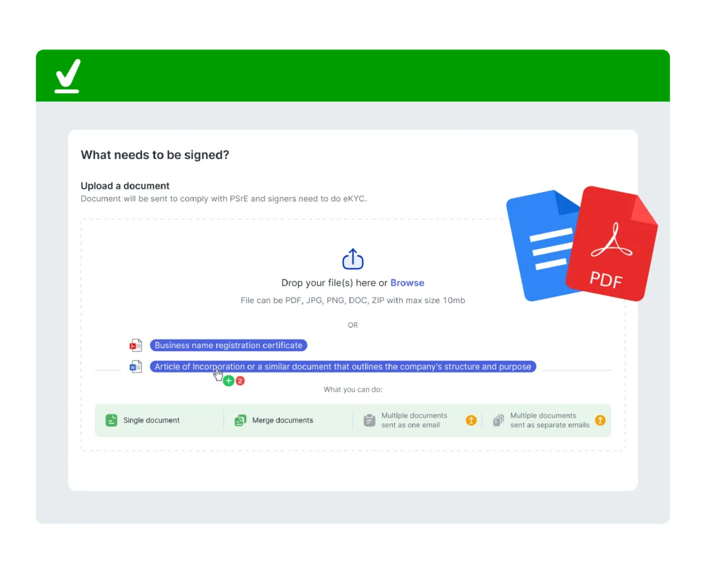 Upload up to 15 documents instantly, merge or manage delivery as required. Complete all from a single dashboard without needing third-party apps.