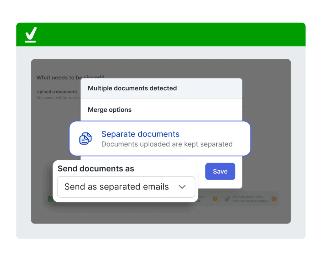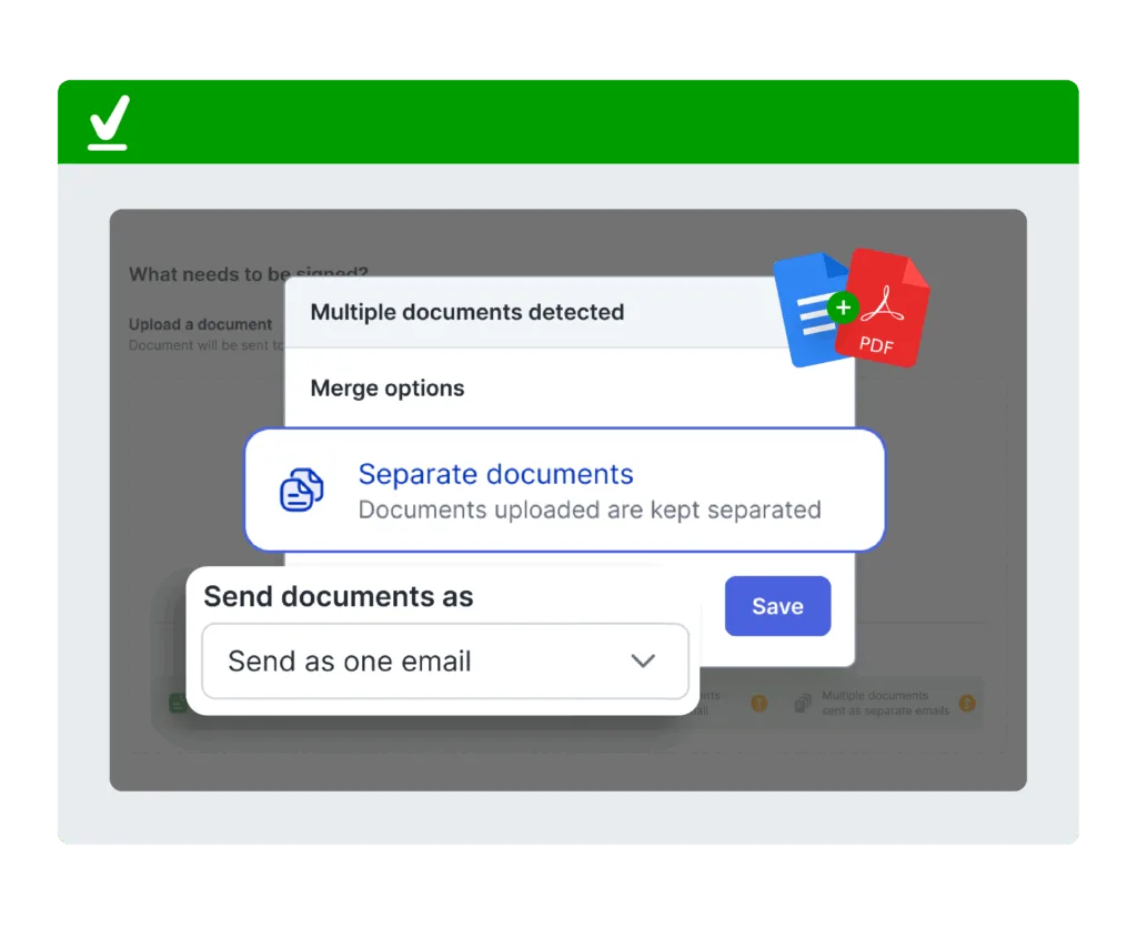 This feature enables you to combine various documents into one PDF file or dispatch them simultaneously in a single email for signing.