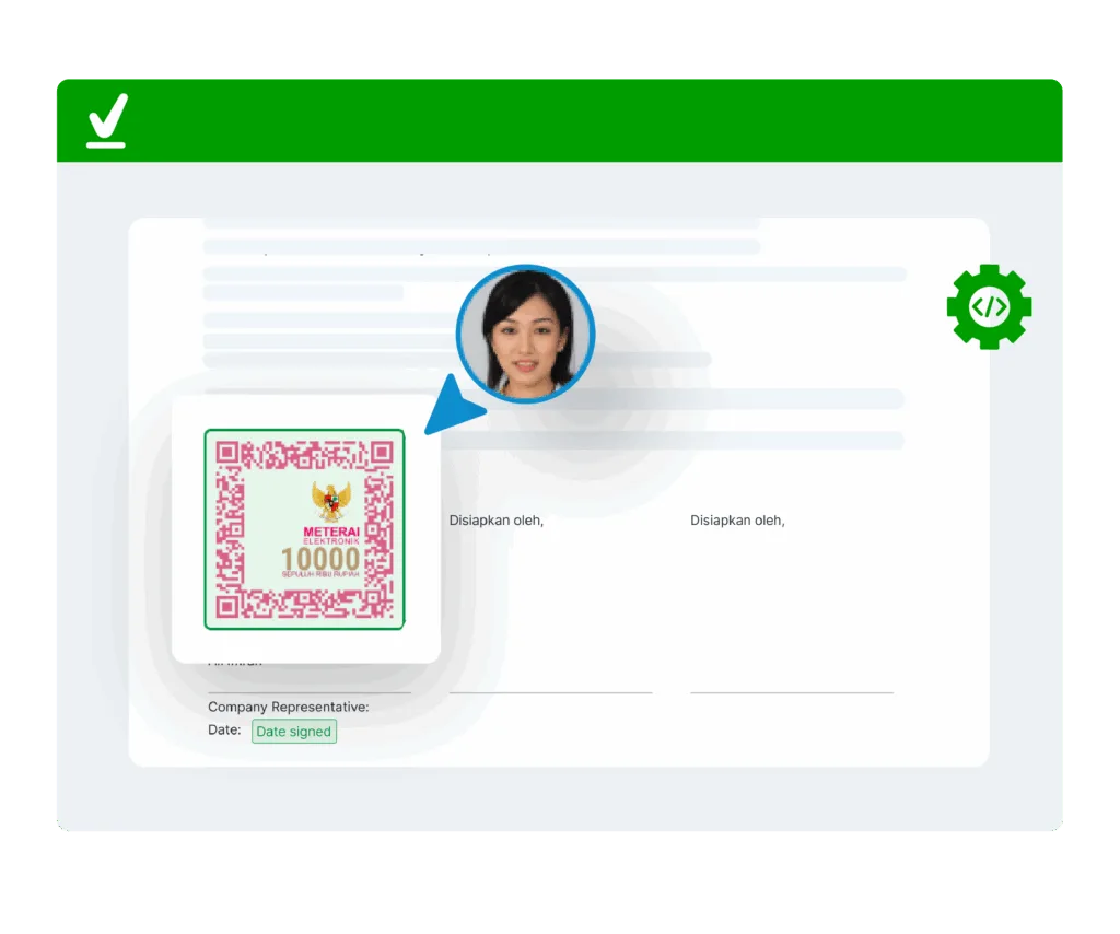 Dengan Open API, proses tanda tangan dan meterai elektronik bisa langsung terhubung dengan sistem bisnis yang Anda gunakan. Tanpa harus berpindah aplikasi atau membuat akun tambahan.