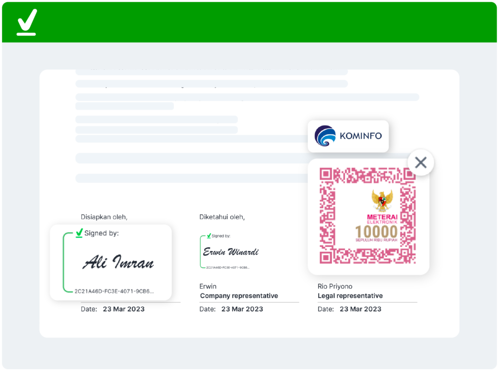 Draf, kirim, dan tandatangani dokumen dalam satu platform terpadu. Dapatkan perjanjian lebih cepat dengan tanda tangan digital tersertifikasi PSrE dan eMeterai resmi Peruri.